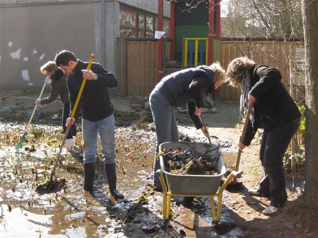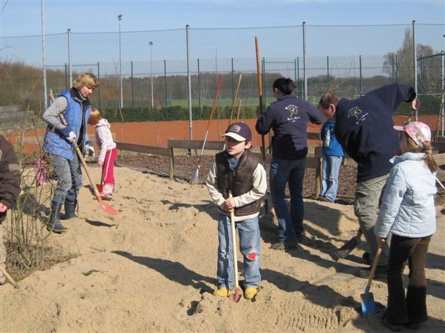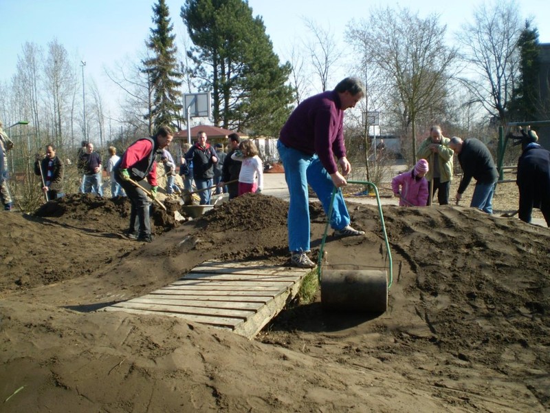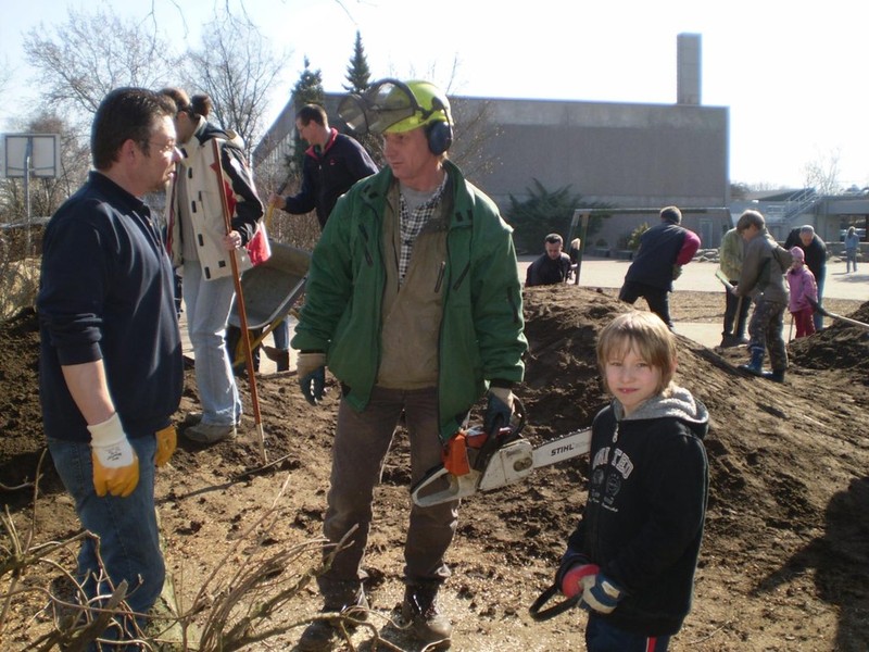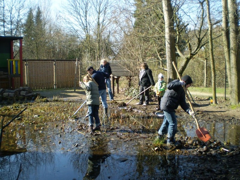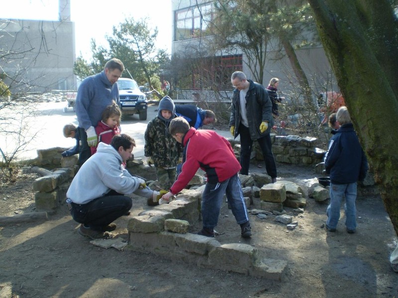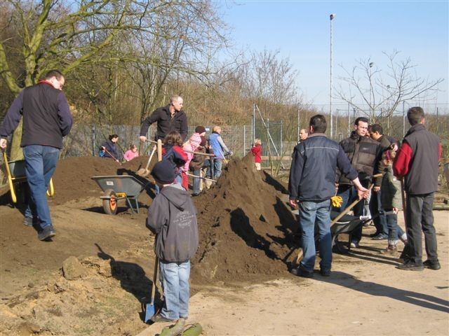 ... wurden bei strahlendem Sonnenschein die Erdhügel erhöht, die Sandkiste aufgefüllt, die Burgruine erneuert und der Schulteich gereinigt.